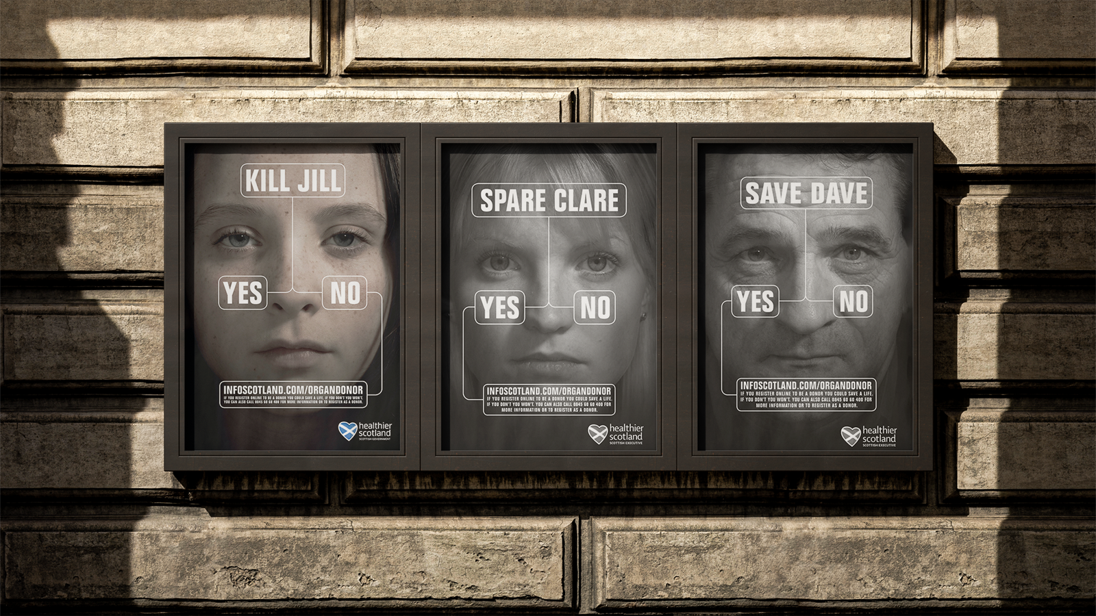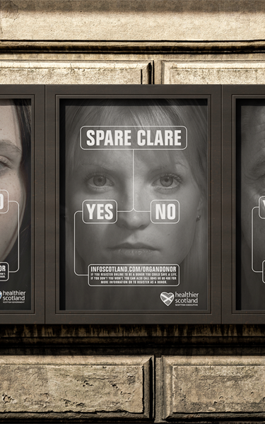 Back in 2008 the issue of organ donation was a particularly contentious one. Over 700 people in Scotland were waiting for an organ transplant because of a chronic shortage of suitable donors. The reason? Over 70% of Scots had not signed the Organ Donor Register. In response we worked with the Scottish Government to develop a new campaign to encourage sign ups. We tested TV as the lead media for the first time, with the core concept being supported by press, outdoor and field marketing. The campaign, courting controversy by stating the obvious implications of national apathy, worked way beyond expectations.